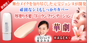 華劇 シミ・くすみ・にきび跡・シワ・たるみなどあらゆる肌の悩みをカバー 舞台を知り尽くした元タカラジェンヌが開発! ひと塗りで女優のような1点の曇りもない完璧な仕上がりに・・! 宝塚の舞台用として使われている「ドーラン」をカバー力をそのままに、 どなたでも使いやすく開発した商品です。 定価3791円(税別) |